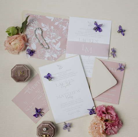 This dreamy invitation suite for Lauren & Matt’s June wedding includes blush, pink, and muted purple florals, it perfectly captures the romantic, elegant vibe they envisioned for their big day, and captures their timeless love story deserved an equally timeless design, and I couldn’t be happier with how it all came together.